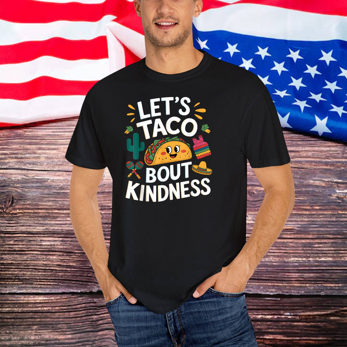 Made from high-quality, soft cotton material, this shirt is not only comfortable to wear but also durable for everyday use. The vibrant design features a cute taco illustration with the message “Let’s Taco bout Kindness” printed in bold, fun fonts.