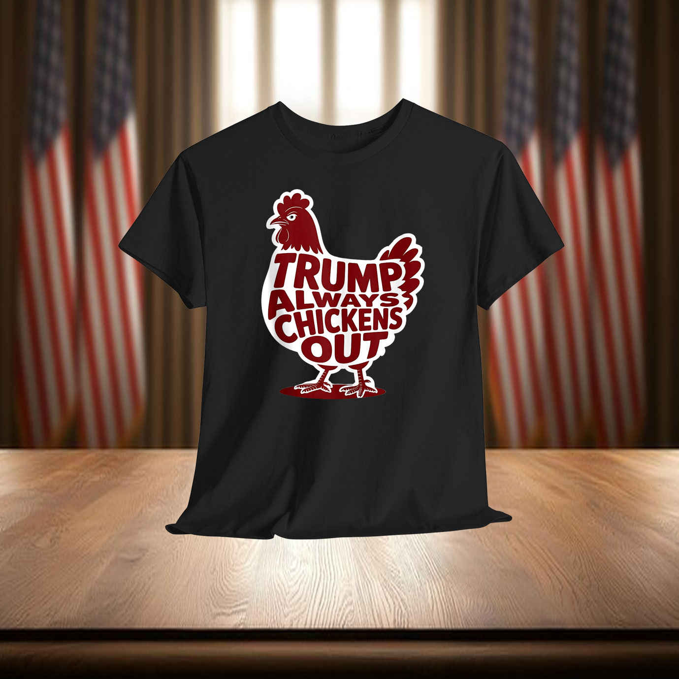 The shirt showcases a humorous illustration of a cartoon chicken wearing a Trump wig, accompanied by the playful slogan “Trump Always Chickens Out.” This clever and witty design is a great way to express your opinions and sense of humor in a lighthearted and fun manner.